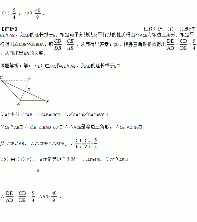 如图,在△ABC中,∠CAB=120°,AD是∠CAB的平分线,AC=10,AB=8.
