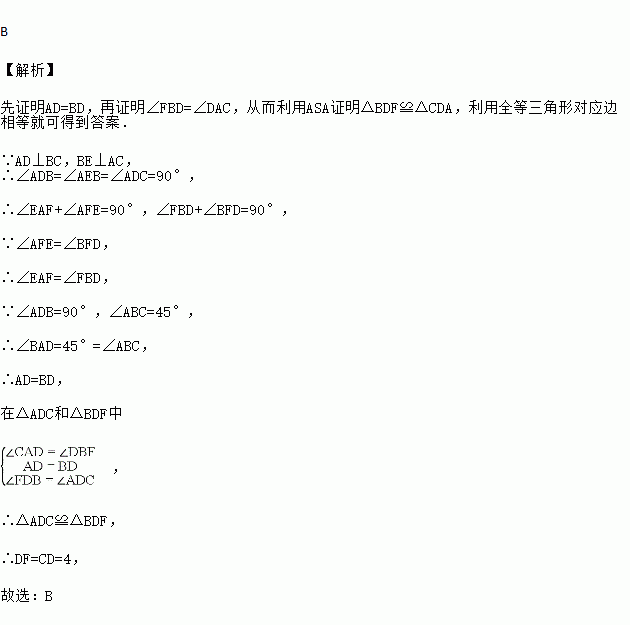 如图,在△ABC中,∠ABC=45°,F是高AD和BE的交点,CD=4,则线段DF的长为( )