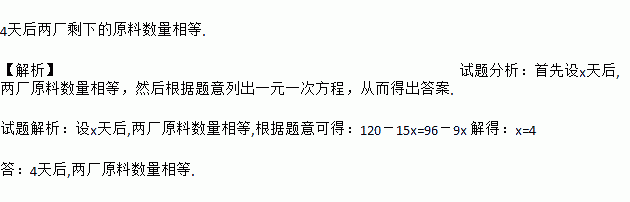 4天后两厂剩下的原料数量相等. 【解析】试题分析:首先设x天后,两厂原料数量相等,然后根据题意列出一元一次方程,从而得出答案. 试题解析:设x天后,两厂原料数量相等,根据题意可得:120-15x=96-9x 解得:x=4 答:4天后,两厂原料数量相等.