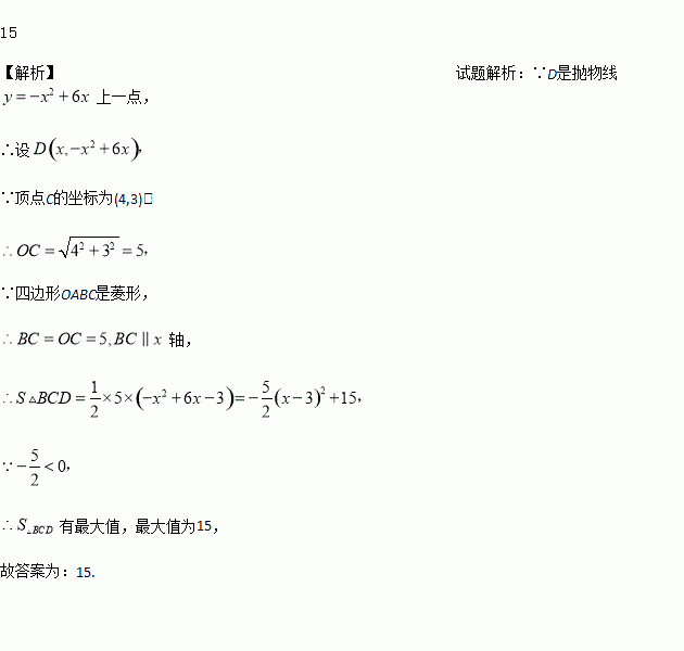 如图,在平面直角坐标系中,菱形OABC 的顶点 A 在 x 轴正半轴上,顶点 C 的坐标为(4,3),D是抛物线 y=﹣x2+6x上一点,且在x轴上方,则△BCD 面积的最大值为__________