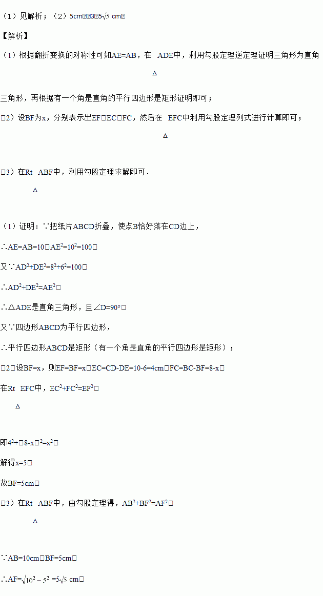 如图,四边形ABCD为平行四边形纸片.把纸片ABCD折叠,使点B恰好落在CD边上,折痕为AF.且AB=10cm、AD=8cm、DE=6cm.