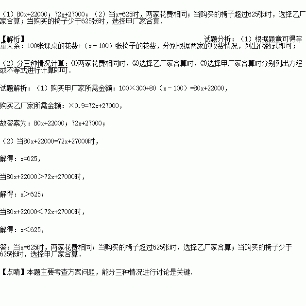 甲、乙两厂家生产的课桌和座椅的质量、价格一致,每张课桌300元,每张椅子80元,甲、乙两个厂家推出各自销售的优惠方案,甲:买一张课桌送1张椅子;乙:课桌和椅子全部按原价的9折优惠.现某学校要购买100张课桌和x(x≥100)张椅子.