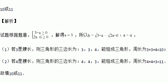 已知a,b为等腰三角形的两条边长,且a,b满足b=++4,求此三角形的周长.