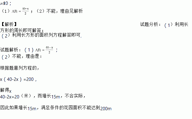 某居民小区要在一块一边靠墙的空地上修建一个矩形花园ABCD,花园的一边靠墙,另三边用总长为40m的栅栏围成如图所示![]()