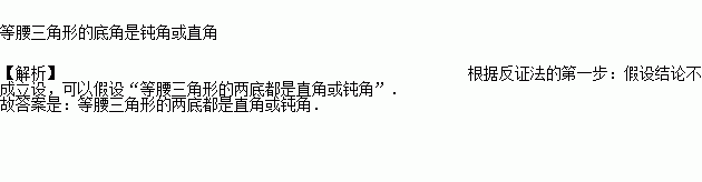 用反证法证明“等腰三角形的底角是锐角”时首先应假设___________________.