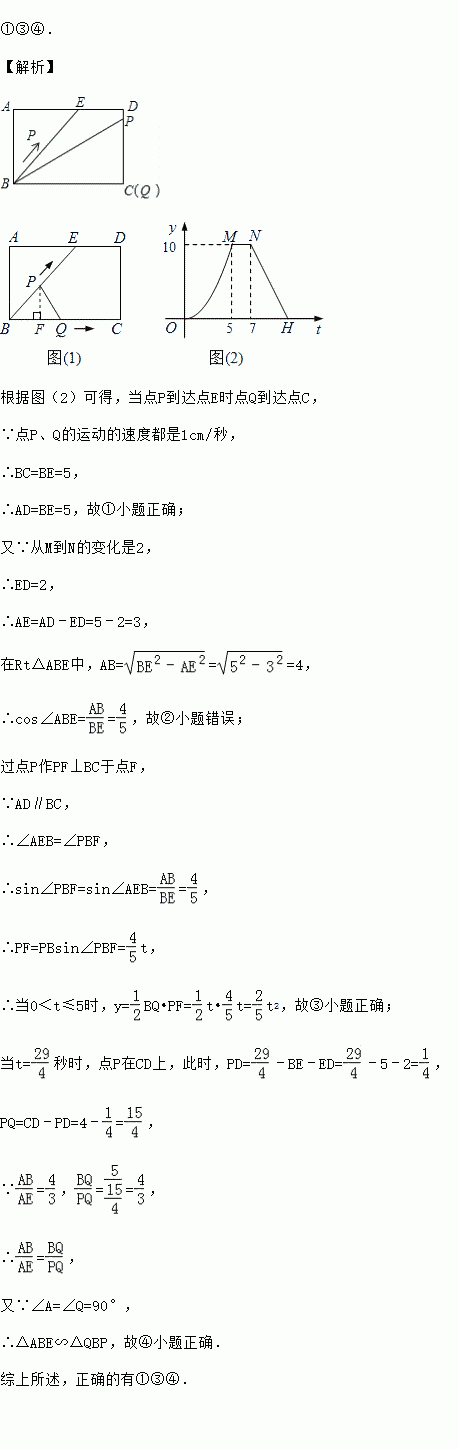 如图(1)所示,E为矩形ABCD的边AD上一点,动点P、Q同时从点B出发,点P沿折线BE﹣ED﹣DC运动到点C时停止,点Q沿BC运动到点C时停止,它们运动的速度都是1cm/秒.设P、Q同发t秒时,△BPQ的面积为ycm2.已知y与t的函数关系图象如图(2)(曲线OM为抛物线的一部分),则下列结论:①AD=BE=5;②cos∠ABE=