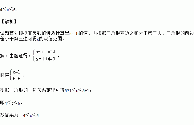 设△ABC三边为a、b、c,其中a、b满足|a+b﹣6|+(a﹣b+4)2=0,则第三边c的取值范围_________________.