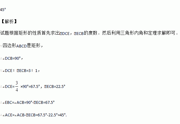 已知:如图,在矩形ABCD中,CE⊥BD,E为垂足,∠DCE:∠ECB=3:1,则∠ACE=________.