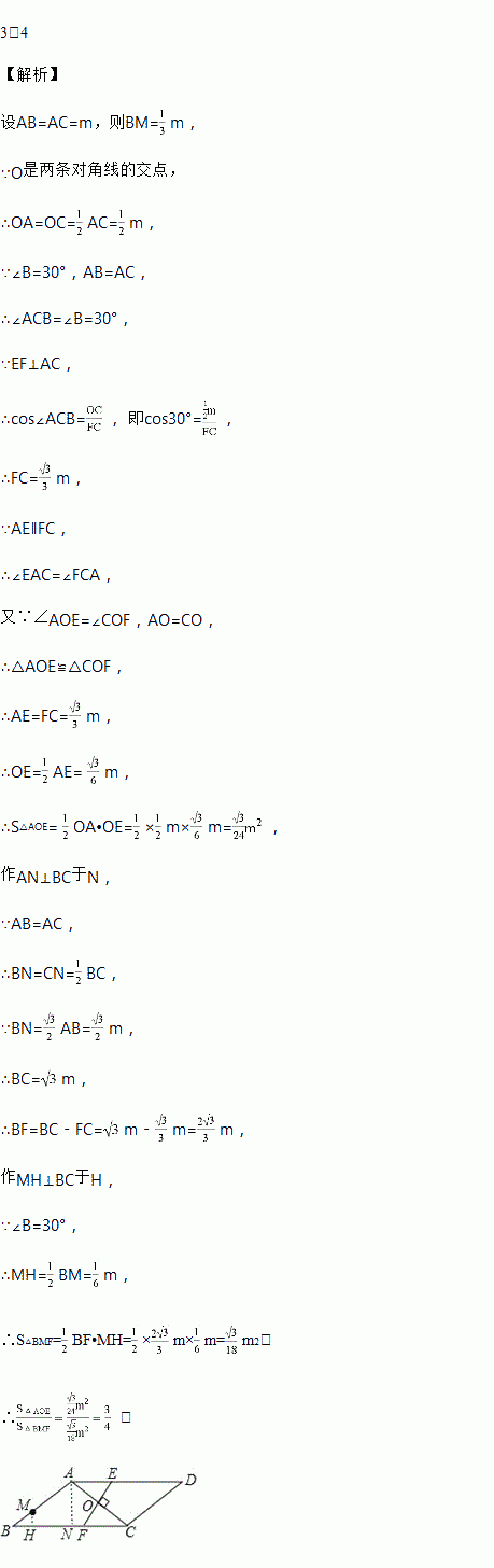 如图,在?ABCD中,∠B=30°,AB=AC,O是两条对角线的交点,过点O作AC的垂线分别交边AD,BC于点E,F,点M是边AB的一个三等分点.连接MF,则△AOE与△BMF的面积比为________.