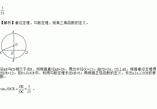 如图,AB是⊙O的直径,弦CD⊥AB,垂足为E,如果AB=26,CD=24,那么sin∠OCE= ▲ .