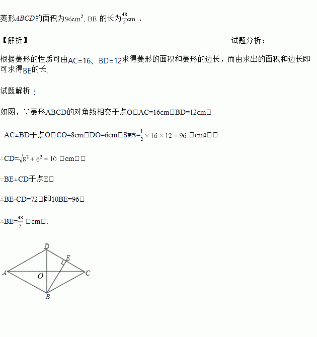 已知:菱形ABCD中,对角线于点E,求菱形ABCD的面积和BE的长.