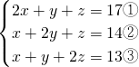 分析:先设□=x,△=y,○=z,根据题意列出方程2x+y+z=17①,x+2y+z=14②,x+y+2z=13③,然后用加减消元法和代入法解方程即可.