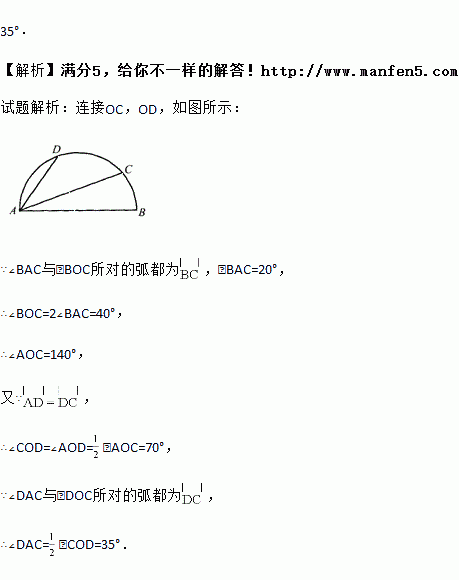 如图,AB是半圆的直径,∠BAC=20°,D是 的中点,则∠DAC的度数是________.