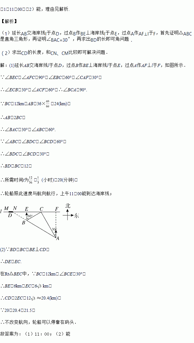 如图,在一条笔直的东西向海岸线l上有一长为1.5km的码头MN和灯塔C,灯塔C距码头的东端N有20km.一轮船以36km/h的速度航行,上午10:00在A处测得灯塔C位于轮船的北偏西30°方向,上午10:40在B处测得灯塔C位于轮船的北偏东60°方向,且与灯塔C相距12km.