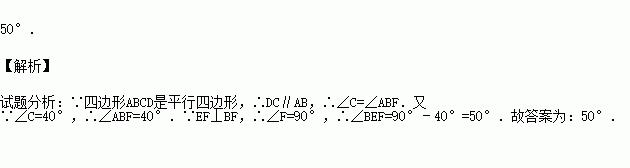 如图所示,在?ABCD中,∠C=40°,过点D作AD的垂线,交AB于点E,交CB的延长线于点F,则∠BEF的度数为 .