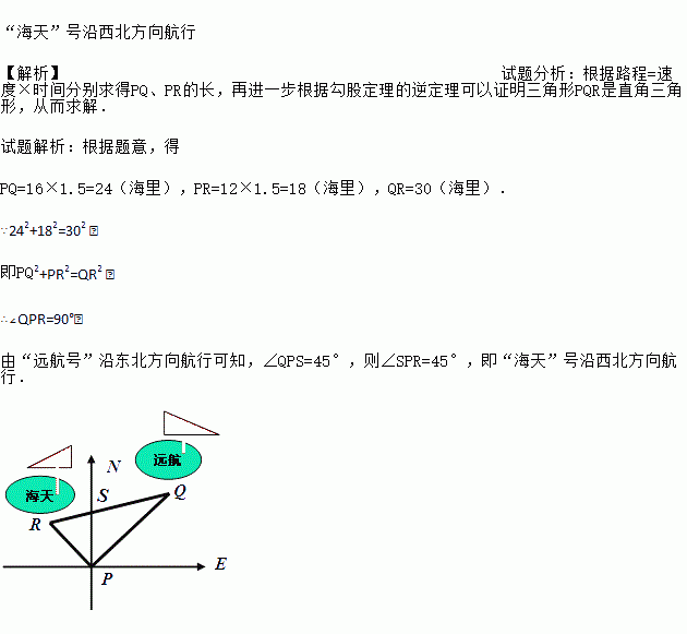 某港口位于东西方向的海岸线上.“远航”号、“海天”号轮船同时离开港口,各自沿一固定方向航行,“远航”号每小时航行16海里,“海天”号每小时航行12海里.它们离开港口一个半小时后相距30海里.如果知道“远航”号沿东北方向航行,能知道“海天”号沿哪个方向航行?为什么?