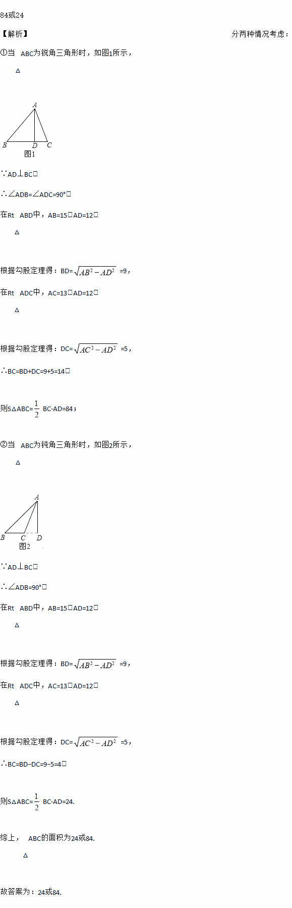 △ABC中,AB=15,AC=13,高AD=12,则△ABC的面积为______________。