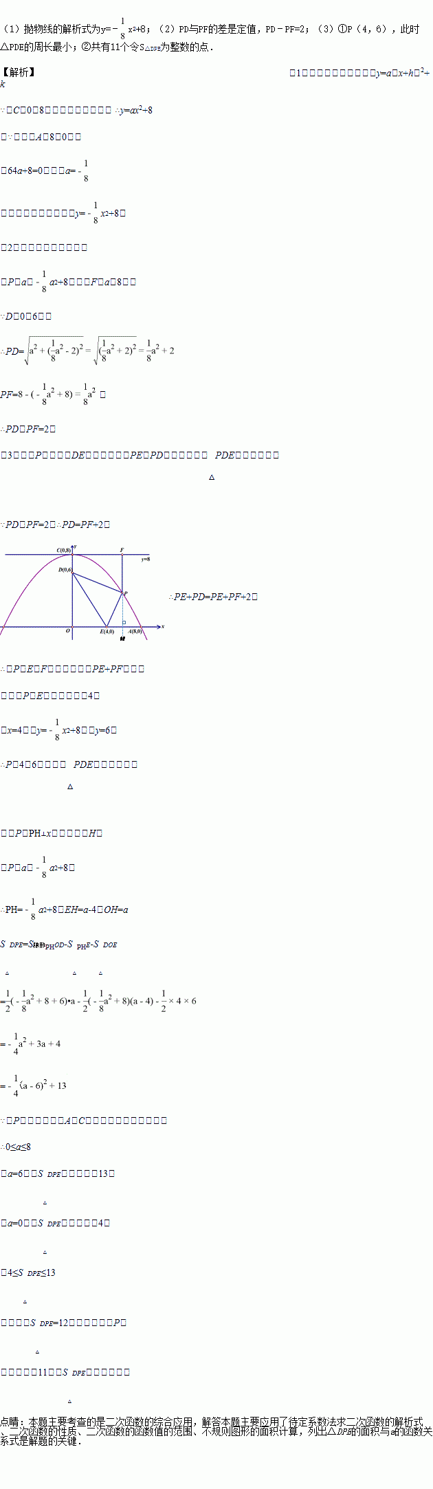 如图,抛物线的顶点坐标为C(0,8),并且经过A(8,0),点P是抛物线上点A,C间的一个动点(含端点),过点P作直线y=8的垂线,垂足为点F,点D,E的坐标分别为(0,6),(4,0),连接PD,PE,DE.