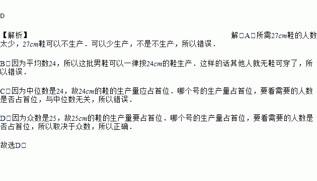 D. 因为众数是25,故25cm的鞋的生产量要占首位