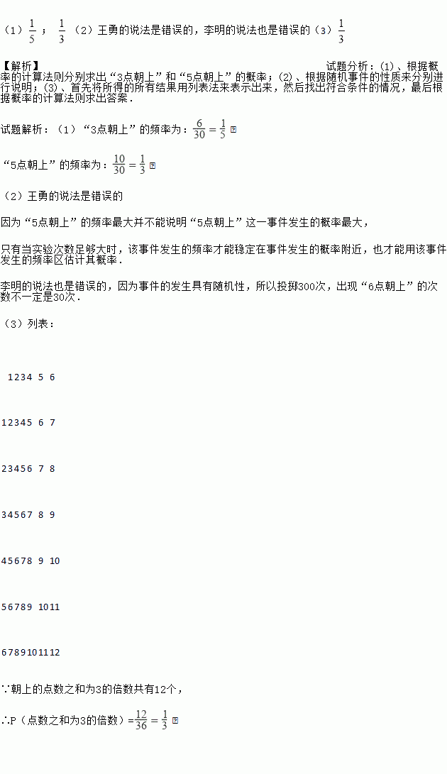 (1); (2)王勇的说法是错误的,李明的说法也是错误的(3) 【解析】试题分析:(1)、根据概率的计算法则分别求出“3点朝上”和“5点朝上”的概率;(2)、根据随机事件的性质来分别进行说明;(3)、首先将所得的所有结果用列表法来表示出来,然后找出符合条件的情况,最后根据概率的计算法则求出答案. 试题解析:(1)“3点朝上”的频率为:, “5点朝上”的频率为:; (2)王勇...