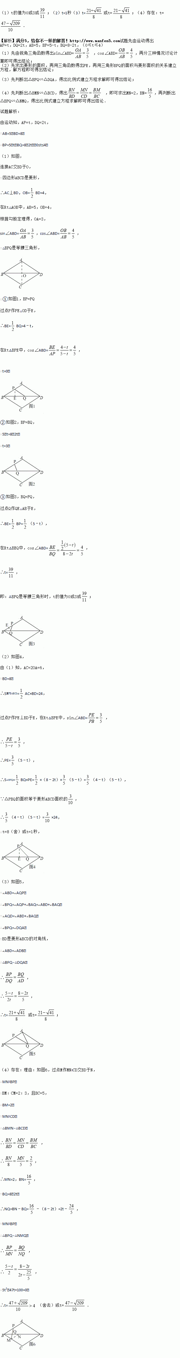 如图,菱形ABCD的边长为5 厘米,对角线BD长8厘米.点P从点A出发沿AB方向匀速运动,速度为1厘米秒;点Q从点D 出发沿DB 方向匀速运动,速度为2 厘米/秒:P、Q 同时出发,当点Q与点B重合时,P、Q停止运动,设运动时间为t秒,解答下列问题: