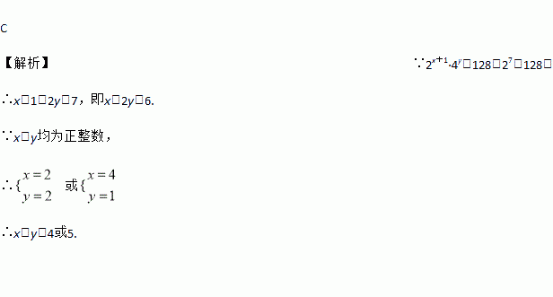 C 【解析】∵2x+1·4y=128,27=128, ∴x+1+2y=7,即x+2y=6. ∵x,y均为正整数, ∴或 ∴x+y=4或5.
