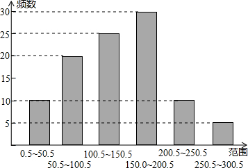 分析:(1)用100乘以频率求出0.5~50.5范围内的频数,求出范围中两整数部分的平均数得出组中值,根据频率之和为1,求出100.5~150.5的频率与频数,填表即可;