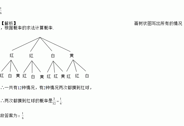 在一个不透明的袋子中装有4个除颜色外完全相同的小球,其中白球1个,黄球l个,红球2个,摸出一个球不放回,再摸出—个球,两次都摸到红球的概率是________。