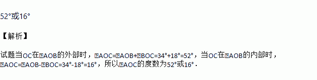 如果∠AOB=34°,∠BOC=18°,那么∠AOC的度数是____.