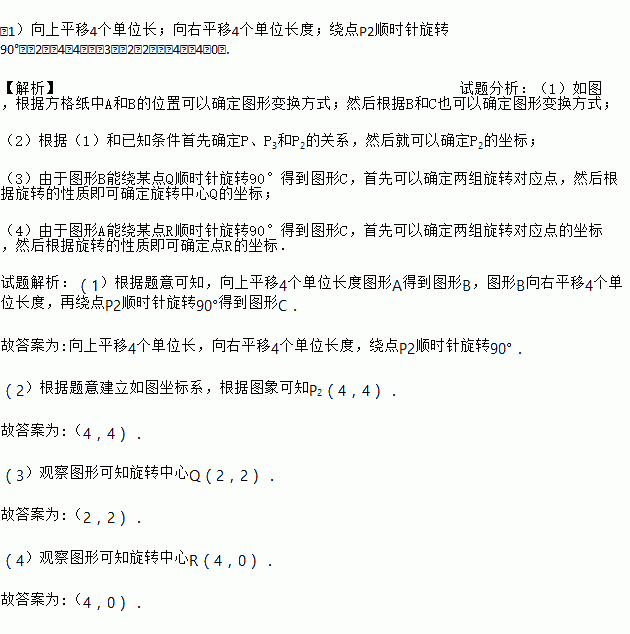 (1)如图,在方格纸中先通过________,由图形A得到图形B,再由图形B先________(怎样平移),再________(怎样旋转)得到图形C(对于平移变换要求回答出平移的方向和平移的距离;对于旋转变换要求回答出旋转中心、旋转方向和旋转角度);