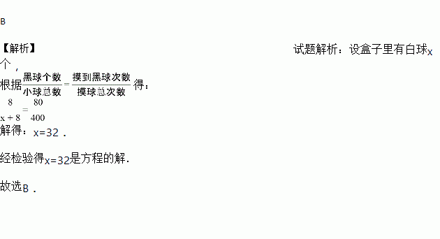 一个密闭不透明的盒子里有若干个白球,在不允许将球倒出来的情况下,为估计白球的个数,小刚向其中放入8个黑球,摇匀后从中随机摸出一个球记下颜色,再把它放回盒中,不断重复,共摸球400次,其中80次摸到黑球,估计盒中大约有白球( )