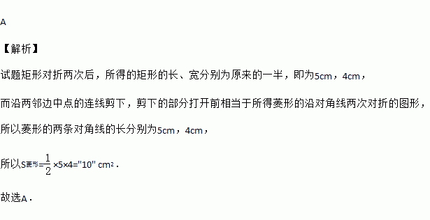 如图,将一个长为10cm,宽为8cm的矩形纸片对折两次后,沿所得矩形两邻边中点的连线(虚线)剪下,再打开,得到的菱形的面积为( )