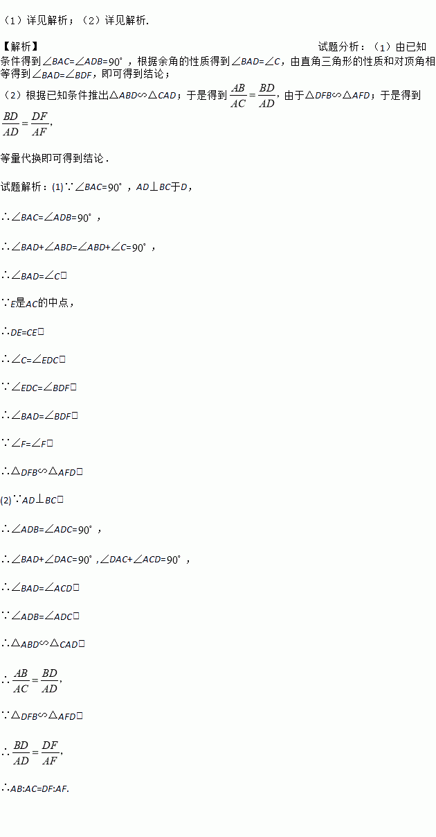如图,已知∠BAC=90°,AD⊥BC于D,E是AC的中点,ED的延长线交AB的延长线于点F.求证: