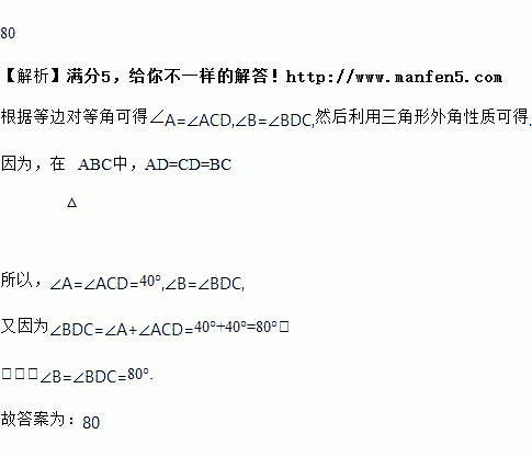 如图,在△ABC中,D为AB上一点,AD=CD=BC,若∠ACD=40°,则∠B=_____°.