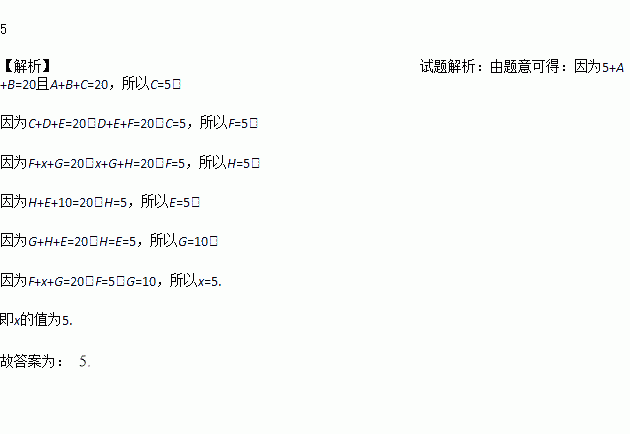下边横排有12个方格,每个方格都有一个数字,若任何相邻三个数字的和都是20,则x=_______.