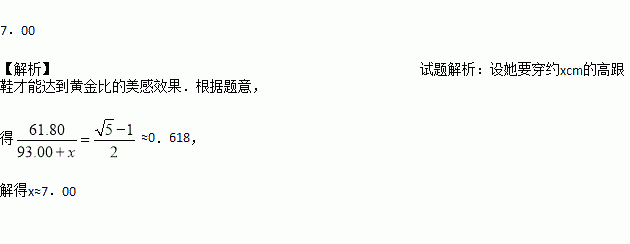 从美学角度来说,人的上身长与下身长之比为黄金比时,可以给人一种协调的美感.某女老师上身长约61.80cm,下身长约93.00cm,她要穿约 cm的高跟鞋才能达到黄金比的美感效果(精确到0.01cm)