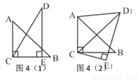 如图4(1),把一副三角板如图(1)放置,其中∠ACB=∠DEC=90°,∠A=45°,∠D=30°,斜边AB=4,CD=5。把三角板DCE绕着点C 顺时针旋转15°得到△D1CE1(如图(2)),此时 AB与CD1交于点O,则线段AD1的长度为______。