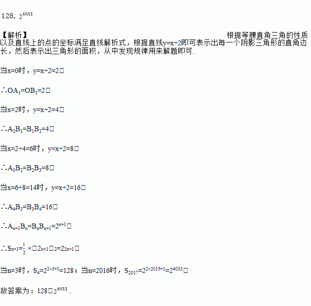 如图,在平面直角坐标系中,直线y=x+2交x轴于点A,交y轴于点A1,若图中阴影部分的三角形都是等腰直角三角形,则从左往右第4个阴影三角形的面积是_____,第2017个阴影三角形的面积是_____.