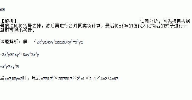 6. 【解析】试题分析:首先根据去括号的法则将括号去掉,然后再进行合并同类项计算,最后将x和y的值代入化简后的式子进行计算即可得出答案. 试题解析:【解析】 (2x2y﹣4xy2)﹣(﹣3xy2+x2y) =2x2y﹣4xy2+3xy2﹣x2y =x2y﹣xy2, 当x=﹣1,y=2时,原式=(﹣1)2×2﹣(﹣1)×22=1×2+1×4=2+4=6.如果规定符号“*”的意义是:a*b=