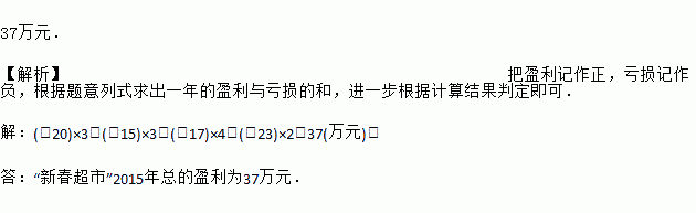 37万元. 【解析】把盈利记作正,亏损记作负,根据题意列式求出一年的盈利与亏损的和,进一步根据计算结果判定即可. 【解析】 (+20)×3+(-15)×3+(+17)×4+(-23)×2=37(万元). 答:“新春超市”2015年总的盈利为37万元.