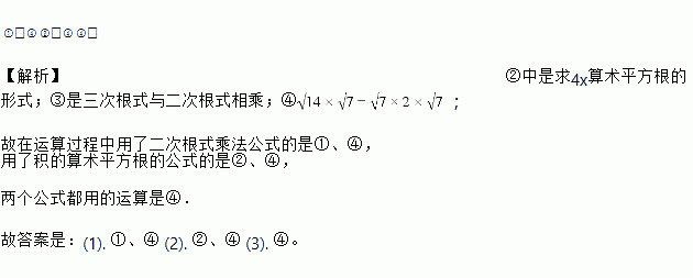 在运算过程中用了二次根式乘法公式的是________,用了积的算术平方根的公式的是__________ ,这两个公式都用的运算是__________。