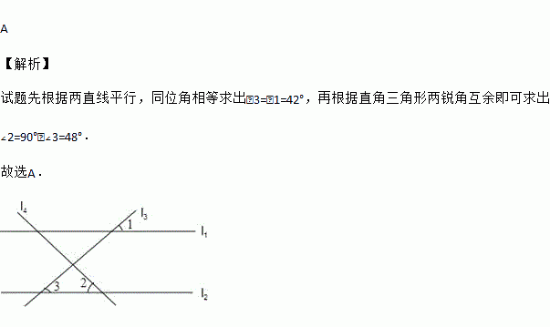 如图,l1∥l2,l3⊥l4,∠1=42°,那么∠2的度数为( )
