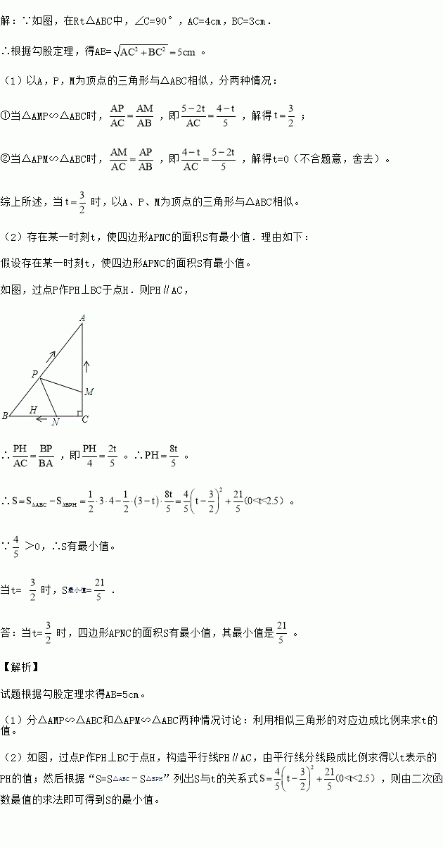 如图,在Rt△ABC中,∠C=90°,AC=4cm,BC=3cm.动点M,N从点C同时出发,均以每秒1cm的速度分别沿CA、CB向终点A,B移动,同时动点P从点B出发,以每秒2cm的速度沿BA向终点A移动,连接PM,PN,设移动时间为t(单位:秒,0<t<2.5).