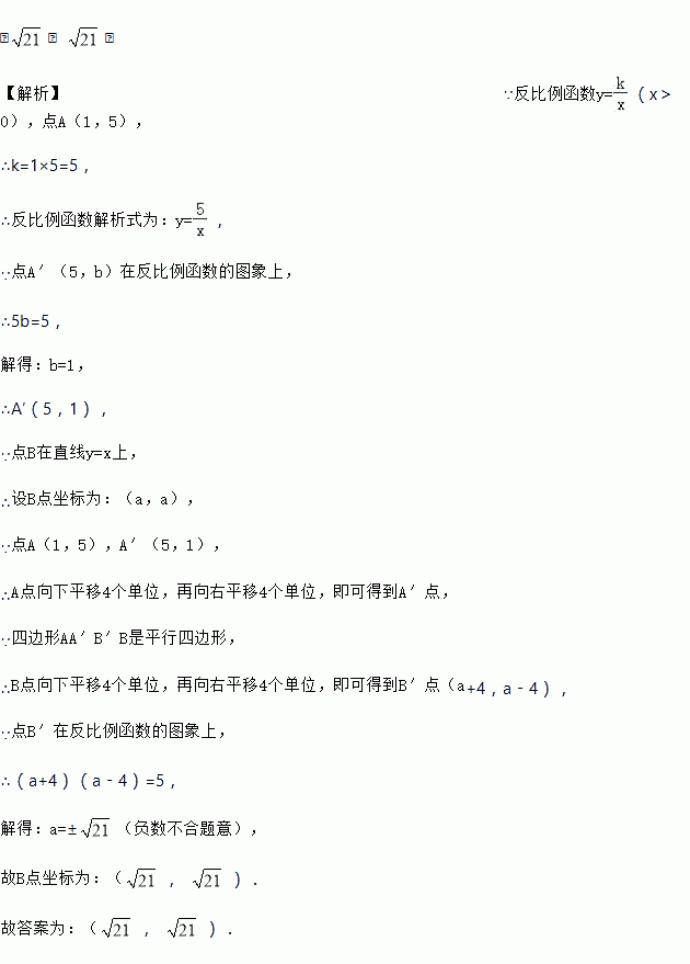 (x>0)与正比例函数y=x(x≥0)的图象,点A(1,5)、点A′(5,b)与点B′均在反比例函数的图象上,点B在直线y=x上,四边形AA′B′B是平行四边形,则B点的坐标为_____.