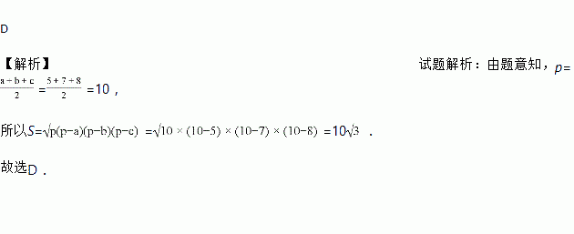 ”.若已知△ABC的三边长分别为a=5、b=7、c=8,则该三角形的面积为