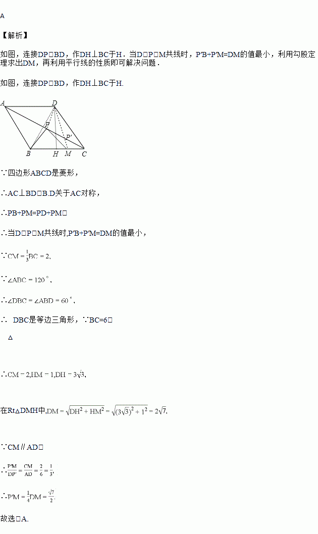 如图,菱形的边长为,,是边的一个三等分点,是对角线上的动点,当的值最小时,的长是( )