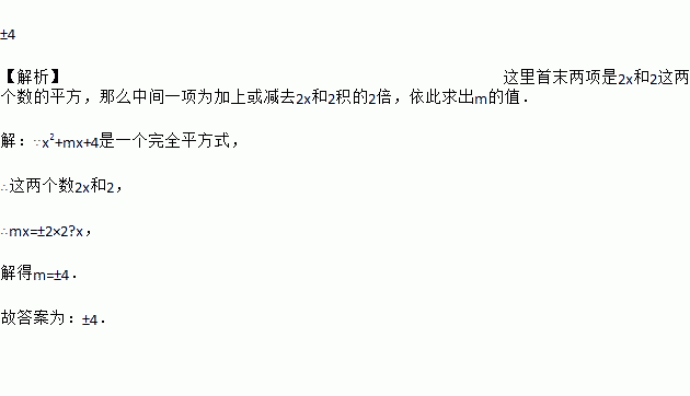 ±4 【解析】这里首末两项是2x和2这两个数的平方,那么中间一项为加上或减去2x和2积的2倍,依此求出m的值. 【解析】 ∵x2+mx+4是一个完全平方式, ∴这两个数2x和2, ∴mx=±2×2?x, 解得m=±4. 故答案为:±4.