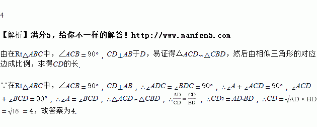 已知:如图,在Rt△ABC中,∠ACB=90°,CD⊥AB于D,AD=2,BD=8,那么CD=_____.