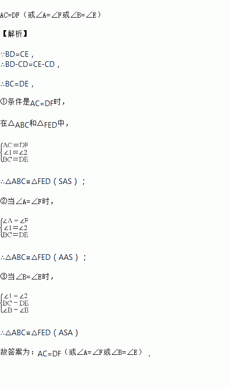 如图,C、D点在BE上,∠1=∠2,BD=EC,请补充一个条件:____________,使△ABC≌△FED.