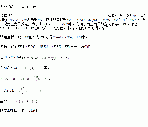 如图,小俊在A处利用高为1.5米的测角仪AB测得楼EF顶部E的仰角为30°,然后前进12米到达C处,又测得楼顶E的仰角为60°,求楼EF的高度.(结果精确到0.1米)